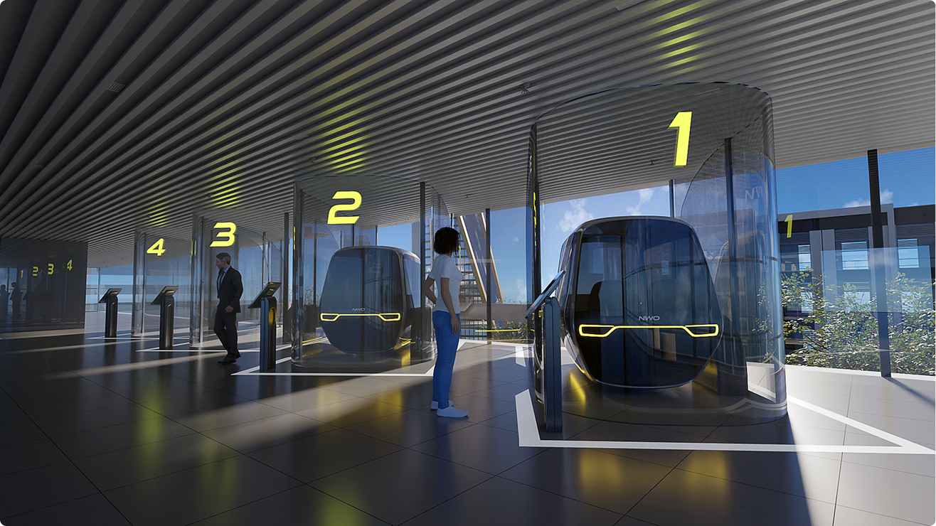 NWO Commute is an autonomous, all-electric pod network that operates on a dedicated pathway for high-frequency short-distance commutes.